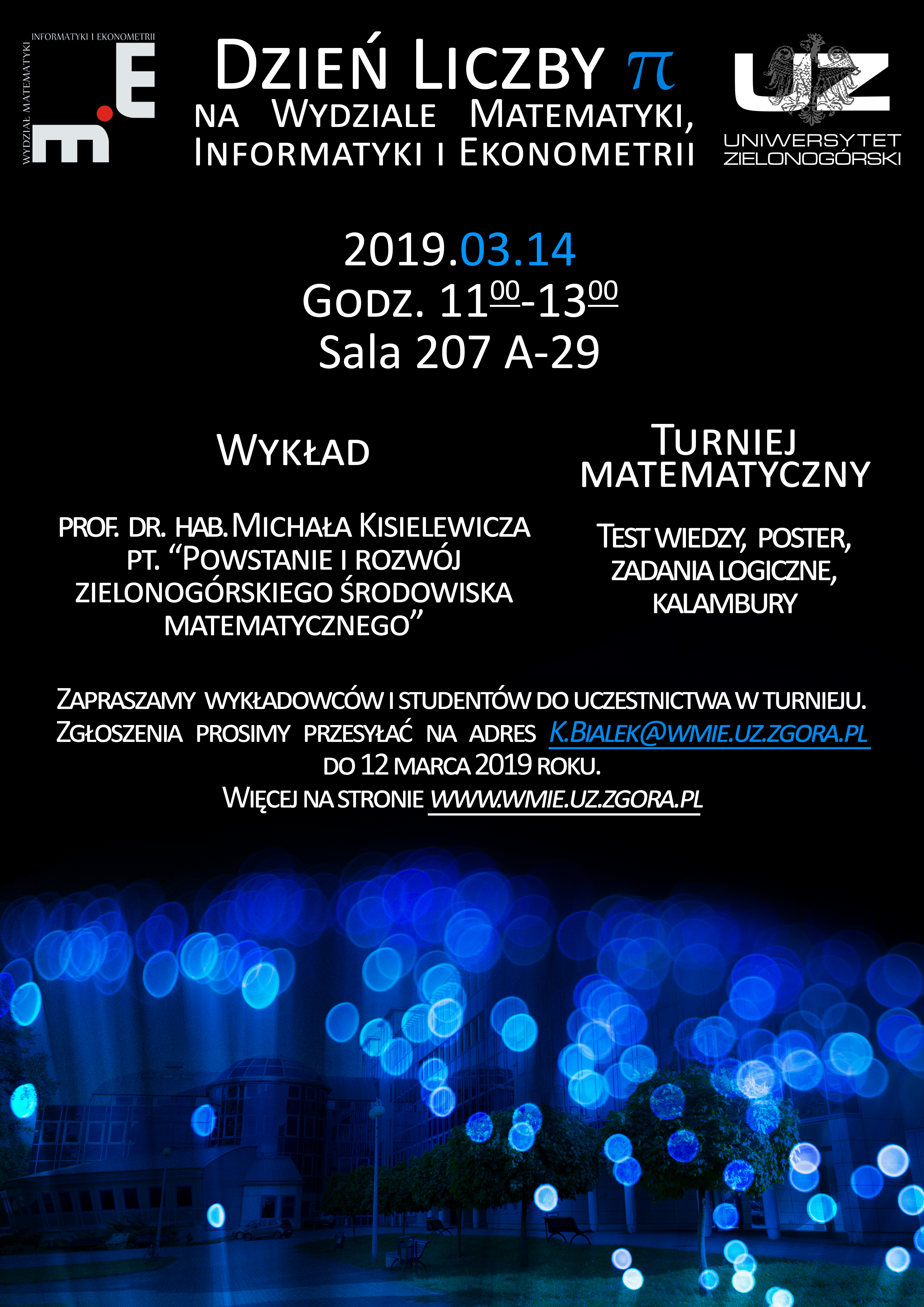Wspólne świętowanie Dnia Liczby π jest nie tylko dobrą okazją do integracji społeczności naszego Wydziału - nauczycieli akademickich i studentów wszystkich kierunków studiów WMIiE, ale również możliwością wspólnego uczczenia Jubileuszowego Roku Matematyki. Ponadto zapewniamy, że podczas Turnieju nie zabraknie dobrej zabawy i emocjonującej rywalizacji, a także okazji do bliższego zapoznania się z najsłynniejszą liczbą niewymierną . Zachęcamy więc gorąco zarówno wykładowców jak i studentów do zgłaszania swojego udziału w Turnieju na adres K.Białek@wmie.uz.zgora.pl.